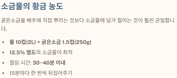 - 절임 시간: 총 30분~40분 이내로 짧게 합니다.