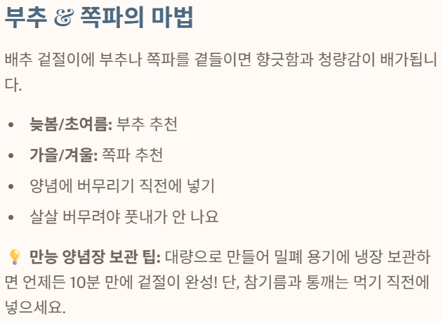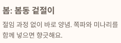 - 봄: 봄동 겉절이 (절임 과정 없이 바로 양념), 쪽파/미나리 첨가.