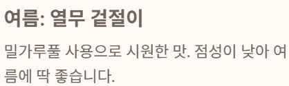 - 여름: 열무 겉절이 (밀가루풀 사용, 찹쌀풀보다 점성이 낮아 시원한 맛).