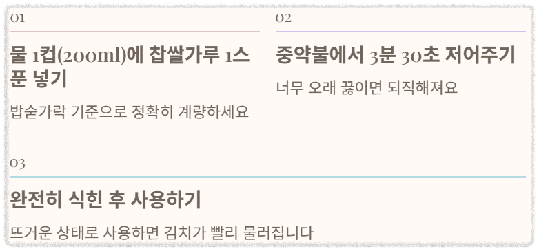 물 1컵(200ml)에 찹쌀가루 1스푼(밥숟가락 기준)을 넣고 중약불에서 딱 3분 30초만 저어주세요. 너무 오래 끓이면 되직해져서 양념에 섞기 어렵고, 너무 적게 끓이면 점성이 부족합니다. 식힌 후 사용해야 김치가 쉽게 물러지지 않아요.