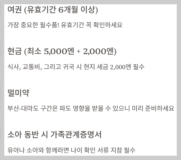 대마도에서 한국으로 돌아올 때 **현지 입출국 세금(터미널 이용료)** 약 2,000엔을 현지에서 지불해야 할 수 있어요. 여행이 끝난 후에도 최소 2,000엔 정도는 남겨두는 센스가 필요합니다. 또, 부산-대마도 구간은 파도 영향을 받을 수 있으니, 배멀미가 걱정된다면 한국에서 미리 멀미약을 챙겨가는 것이 좋습니다.