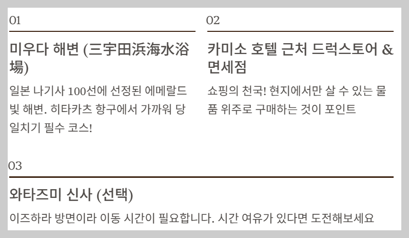 - 1순위: 미우다 해변(三宇田浜海水浴場): 일본의 나기사 100선에 선정될 만큼 아름다운 에메랄드빛 해변입니다. 히타카츠 항구에서 멀지 않아 당일치기 필수 코스로 꼽힙니다.