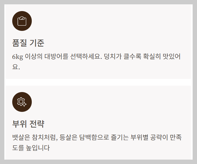 - 품질 구분 기준: **6kg 이상**의 대방어, 맑고 투명한 눈, 선명한 선홍빛 살, 단단한 탄력성을 확인하세요.