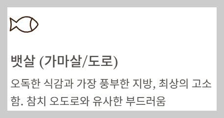 - **뱃살 (가마살/도로):** 오독한 식감과 가장 풍부한 지방, 최상의 고소함.