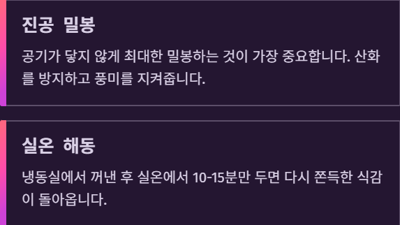 - **소분 포장:** 한 번에 먹을 만큼씩 나누어 소분 포장하세요.