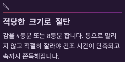 | **1단계 (표면 건조)** | **60℃** | 5~6시간. 표면이 꾸덕하게 마르고 색이 진해지는 것을 확인 |