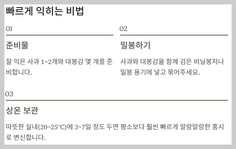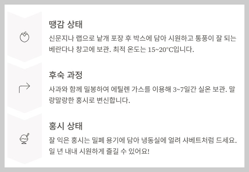 빨리 **대봉감** 홍시를 먹고 싶은 분들을 위한 속성 후숙 **보관법**이에요. 에틸렌 가스를 이용하는 것이 핵심!