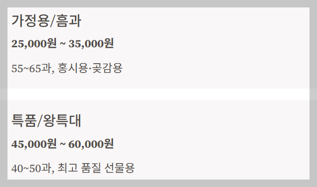 | 일반 중품 | 45~55과 | **37,000원 ~ 42,000원** | 선물용 혼합, 가장 흔한 **구매** **시세** |