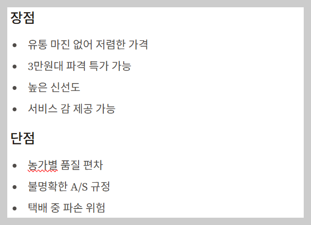 - 단점: 농가마다 품질의 편차가 크고, A/S(환불, 교환) 규정이 명확하지 않을 수 있습니다. **직거래 후기**가 많거나 인증된 농장인지 꼭 확인해야 해요.