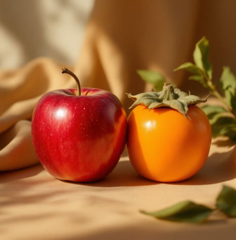 - 1단계: 준비물! 잘 익은 사과 1~2개와 **대봉감** 몇 개를 준비합니다.