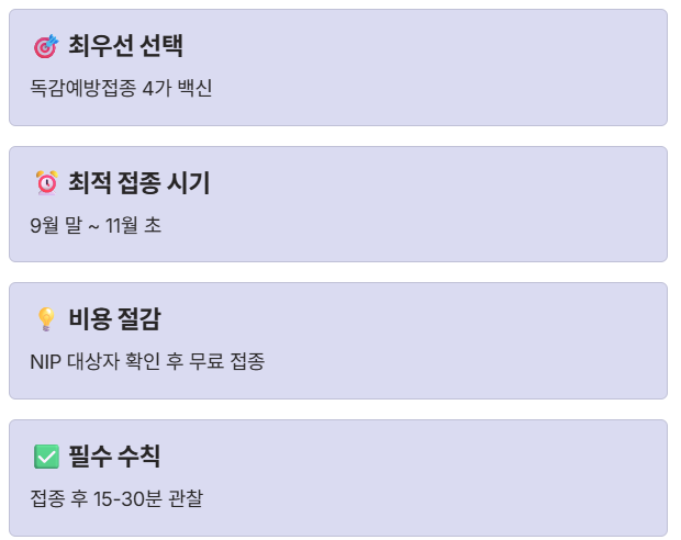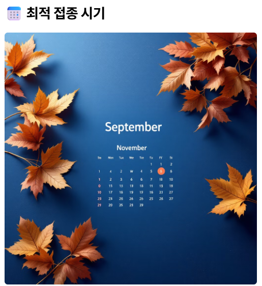 - 2. 최적 시기 사수: 9월 말부터 11월 초 사이에 접종하여 면역력이 최고조에 달하도록 계획하세요.