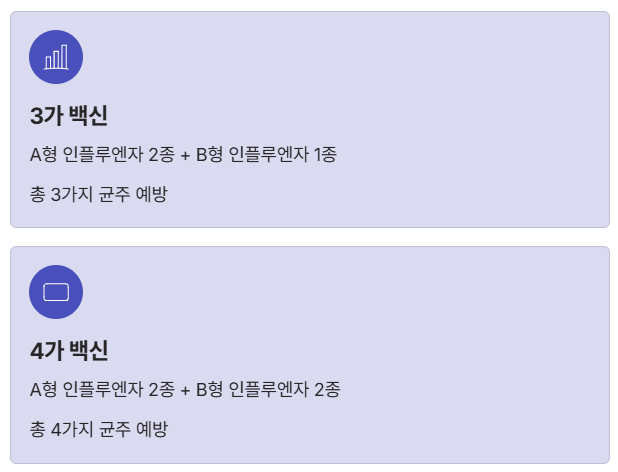 - **4가 백신**: 3가 백신의 구성에 B형 바이러스 1가지를 추가하여 총 **4가지 균주**를 예방합니다. 즉, B형 독감에 대한 방어 범위가 넓어진 것이 핵심이에요.