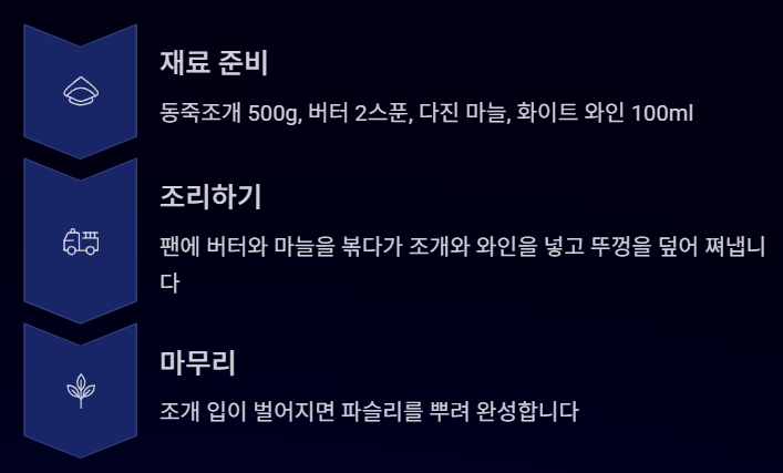 **동죽조개 술찜**의 비결은 바로 '청주' 대신 '화이트 와인'을 사용하는 거예요. 화이트 와인 100ml 정도를 넣어주면 깊은 서양식 감칠맛이 살아납니다. 마지막에 파슬리를 뿌려 시각적인 만족도도 높이세요!