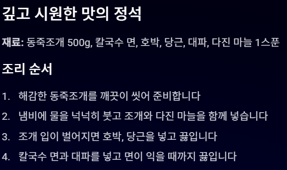 - 핵심 팁: 다진 마늘을 조개와 함께 넣고 끓이면, 마늘이 조개의 비린 맛을 잡고 감칠맛을 극대화합니다.