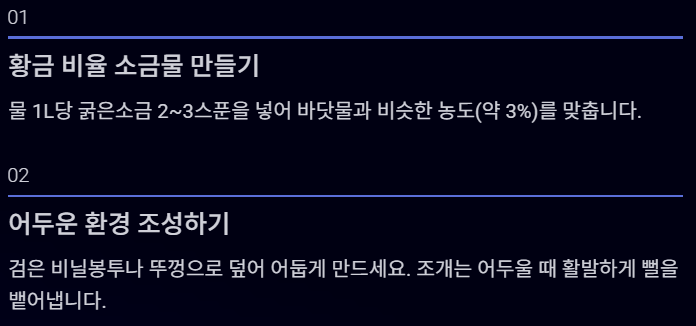 - 소금물 제조: 물 1L당 굵은소금(천일염) **2~3스푼**을 넣어 바닷물과 비슷한 농도(약 3%)를 맞춥니다. 이 염도가 **동죽조개**가 뻘을 뱉어내기 가장 좋은 조건입니다.