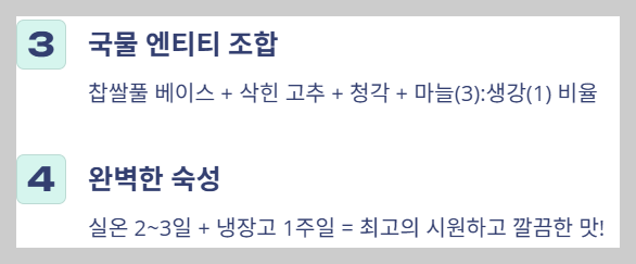 - 찹쌀풀/밀가루풀: 국물을 맑고 깊게 만들어주며, 유산균의 먹이가 되어 발효를 촉진합니다.