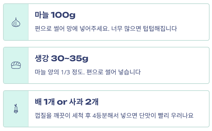 - 생강: 마늘 양의 **1/3인 30~35g**을 편으로 썰어 넣습니다. 생강이 너무 많으면 텁텁합니다.