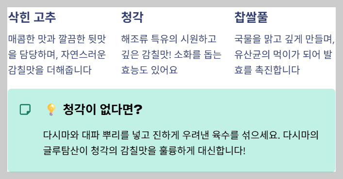 - 청각: 해조류 특유의 시원하고 깊은 감칠맛을 더해주는 '신의 한 수'입니다. **청각 효능**은 소화를 돕는 역할도 합니다.