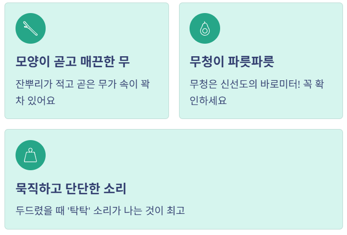 - 3. 묵직하고 단단한 소리: 무를 두드렸을 때 '텅텅' 소리가 아닌 '탁탁' 단단한 소리가 나는 것이 좋습니다. 속이 빈 무는 금방 무르게 됩니다.