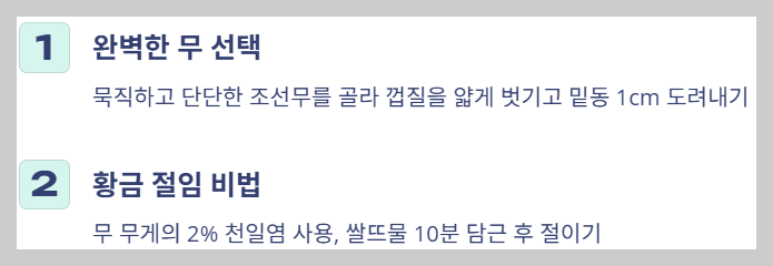 - 무 절이기: **무게의 2% 천일염**을 사용하고, 쓴맛 제거를 위해 쌀뜨물에 담근 후 절인다.