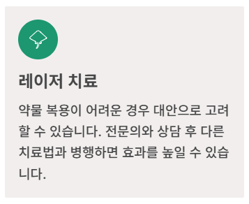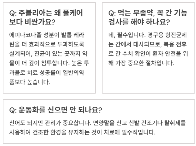 - 약물 선택의 기준: 경증이면 **풀케어**와 같은 일반의약품을, 중등도 이상이거나 빠른 효과를 원하면 **전문의약품(주블리아, 경구약)** 또는 레이저 치료를 고려해야 합니다.