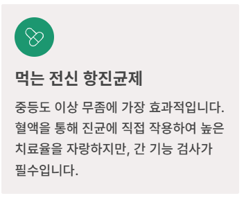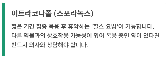 2. **이트라코나졸 (Itraconazole, 스포라녹스 등):** 짧은 기간 복용 후 휴약하는 '펄스 요법'이 가능합니다. 다른 약물과의 상호작용에 더욱 주의해야 해요.