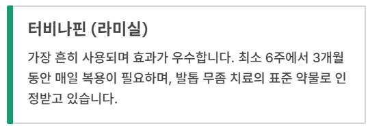 - 치료는 꾸준함이 생명: 발톱은 느리게 자라요. **최소 6개월 이상** 임의로 중단하지 말고, 간 기능 검사와 같은 주의사항을 철저히 지키며 꾸준히 치료해야 완치가 가능합니다.
