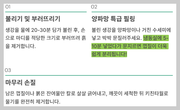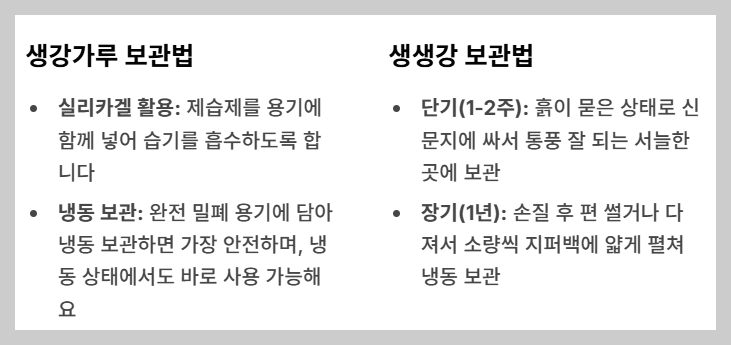 - 장기 (1년): **생강 손질** 후 편 썰거나 다져서 **소량씩 지퍼백에 얇게 펼쳐** 냉동 보관합니다.
