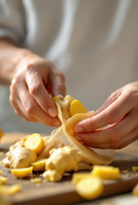 - 방법: 불린 생강을 양파망이나 수세미 안에 넣고 서로 박박 문질러 줍니다.