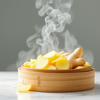 - 찜 과정: 김이 오른 찜기에 면포를 깔고 편 썬 생강을 겹치지 않게 펼칩니다. 10분 ~ 30분 쪄줍니다. 쪄낸 생강은 색이 노랗게 변하며, 향이 더욱 깊어집니다.
