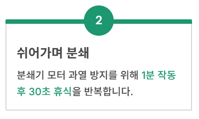 - 쉬어가며 분쇄: 분쇄기 모터 과열을 막고 뭉침을 방지하기 위해 **1분 작동 후 30초 휴식**을 반복합니다.