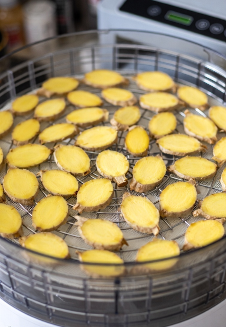 - 묵은 생강 (1년 이상 보관): 특징: 껍질이 두껍고 질기며, 섬유질이 많고 매운맛이 강합니다. 주의 사항: 수분이 적어 건조 시간을 더 정확히 측정해야 합니다.