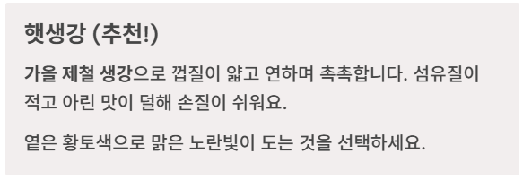 | 구분 | 햇생강 (추천) | 묵은 생강 (비추천) | 품질 확인 팁 |