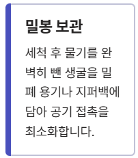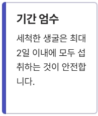 - 기간 엄수: 세척한 **생굴**은 최대 2일 이내에 모두 섭취하는 것이 좋습니다.