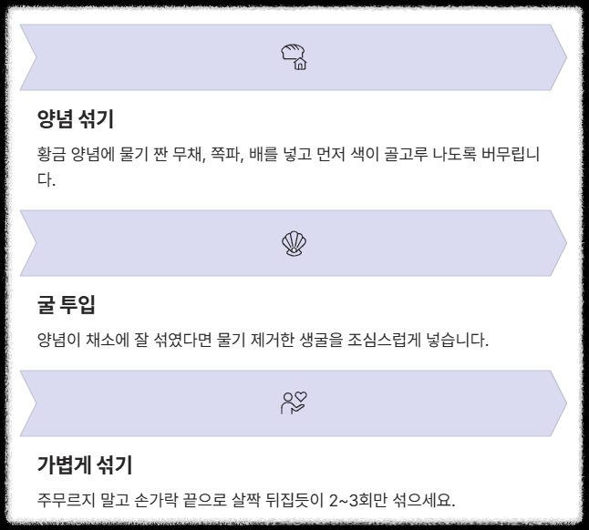 - 2단계 (굴 투입): 양념이 채소에 잘 섞였다면, 세척하여 물기를 완벽히 제거한 **생굴**을 투입합니다.
