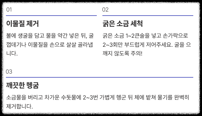 📌 굴무침 성공의 첫걸음: 생굴 세척 및 신선도 관리