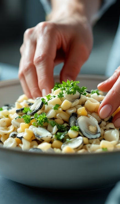 - 1단계: 이물질 제거: 볼에 **생굴**을 담고 물을 약간 넣은 뒤, 굴 껍데기나 이물질을 손으로 살살 골라냅니다.