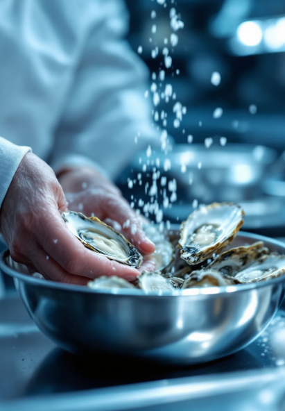 **생굴**을 세척할 때는 **수돗물**이나 **염수**를 이용하고, 절대 흐르는 물에 오래 헹구지 않도록 주의해야 해요. 굴의 풍미가 빠져나갈 수 있거든요.