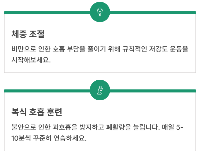 - 체중 조절: 비만으로 인한 호흡 부담을 줄이는 것이 중요합니다. 규칙적인 저강도 운동을 시작해보세요.