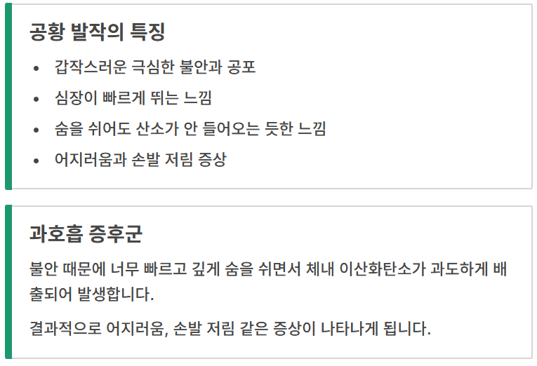 이때 발생하는 것이 **과호흡 증후군**인데요. 불안 때문에 너무 빨리, 깊게 숨을 쉬면서 몸속의 이산화탄소가 과도하게 배출되어 오히려 어지러움, 손발 저림 같은 증상이 나타납니다.