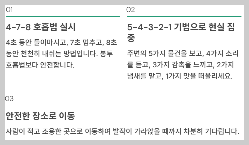 - 침착하게 호흡 조절: 응급 상황이 아니라면 **입술 오므리기 호흡**이나 **4-7-8 호흡법**을 시도하여 과호흡을 예방하고 진정하세요.