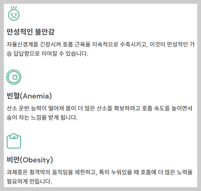 - 빈혈 (Anemia): 피가 부족하면 산소 운반 능력이 떨어져, 몸이 산소를 더 많이 확보하려고 무의식적으로 호흡 속도를 높여 숨이 차는 느낌을 받습니다.