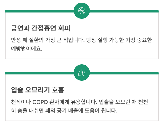 - 금연/간접흡연 회피: 만성 폐 질환의 가장 큰 적입니다. 당장 실행 가능한 가장 중요한 대처법이에요.