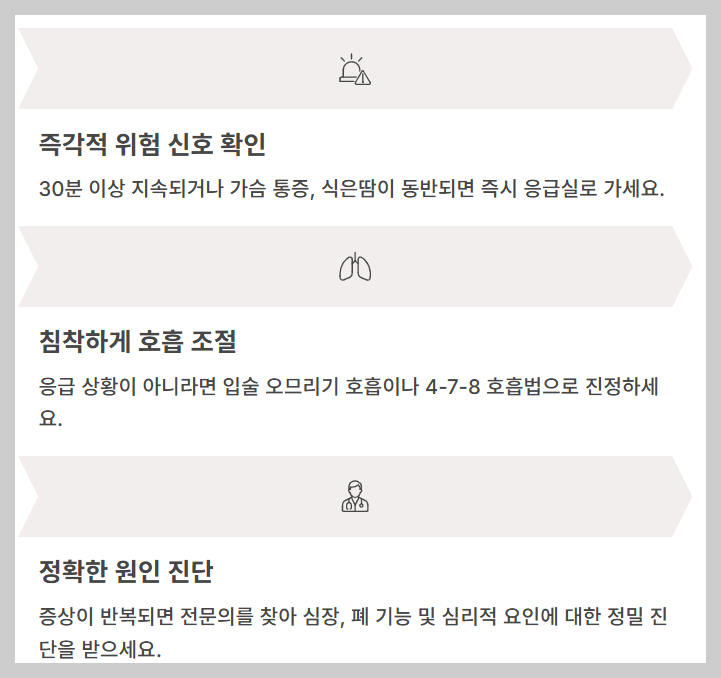 - 정확한 원인 진단: 증상이 반복된다면 가정의학과, 순환기내과, 호흡기내과 등 전문의를 찾아 심장/폐 기능 및 심리적 요인에 대한 **정밀 진단**을 받으세요.