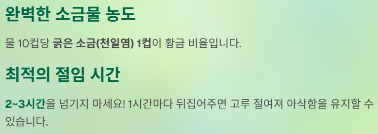 - **소금 농도:** 물 10컵당 **굵은 소금(천일염)** 약 1컵(종이컵 기준) 비율이 적당합니다.