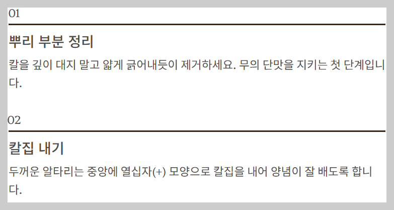 - **칼집 내기:** 무가 두꺼운 알타리는 양념이 잘 배도록 중앙에 열십자(+) 모양으로 칼집을 내주세요.