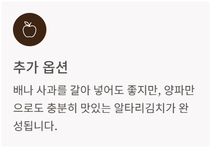 양념장에 **양파 1개를 믹서에 갈아 넣으면** 알타리의 시원한 맛이 배가 되고 자연스러운 단맛을 낼 수 있어요. 배나 사과를 갈아 넣는 것도 좋은 방법이지만, 양파만으로도 충분히 시원하고 맛있는 알타리김치 황금레시피가 완성됩니다.