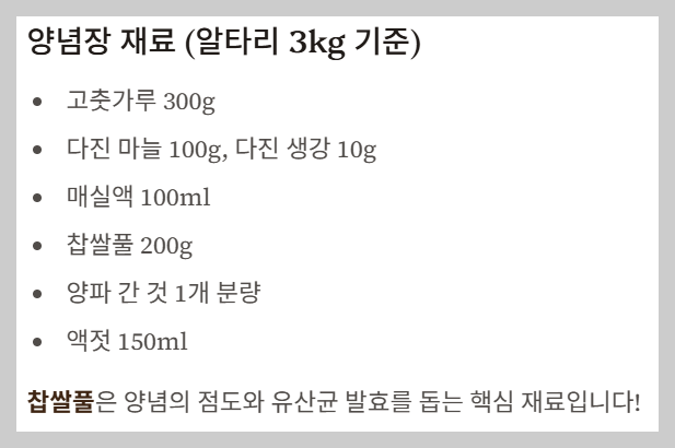 - **기본:** 고춧가루 300g, 다진 마늘 100g, 다진 생강 10g, 매실액 100ml