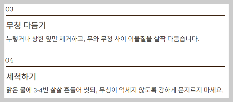 - **세척:** 맑은 물에 서너 번 살살 흔들어 씻어주세요. 무청이 억세지 않도록 강하게 문지르지 않는 것이 중요해요.