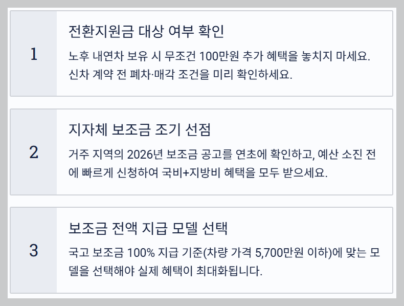 - **전환 지원금의 조건 선확보:** 전환 지원금 100만 원은 내연기관차를 EV로 교체하는 '선착순' 개념이 강하므로, 2026년 초에 구매 계획을 세워 노후 차량 처리와 신차 계약을 동시에 진행하는 것이 유리합니다.